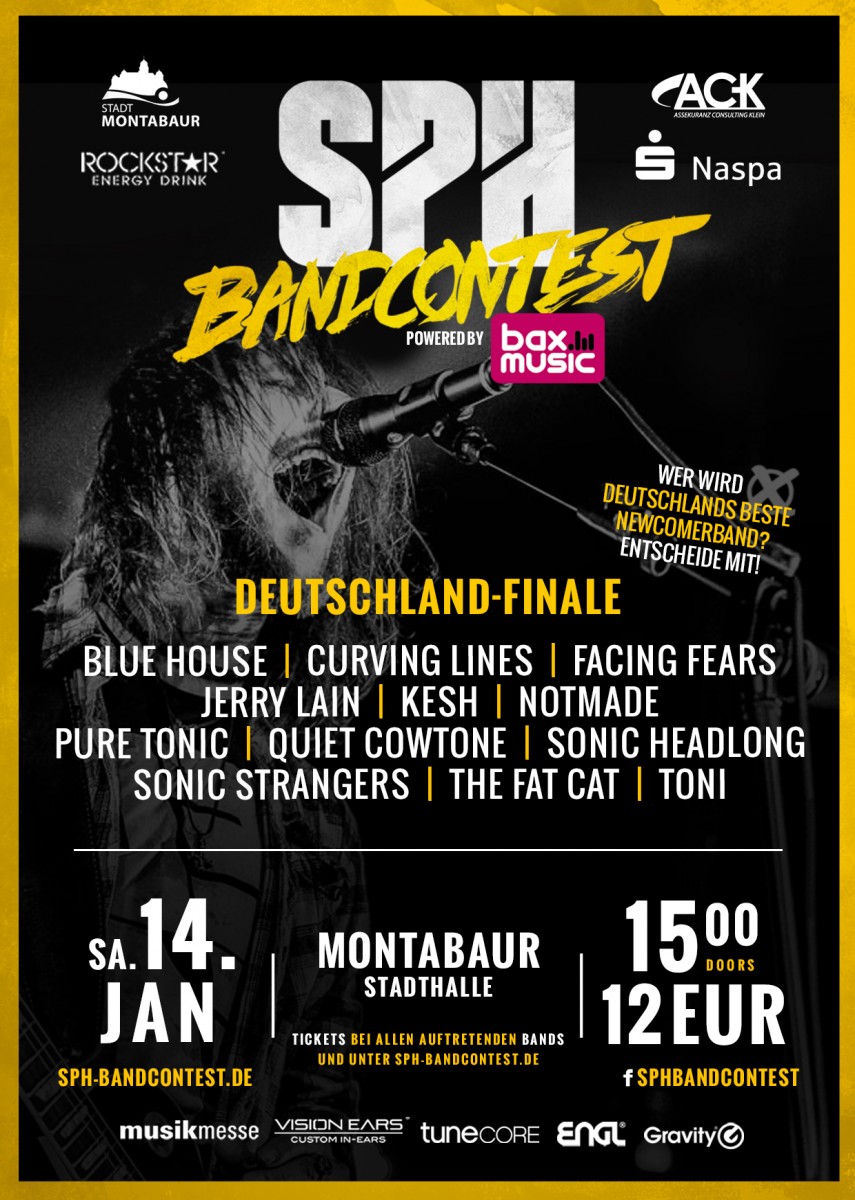 Der Schnee fällt, die Winterlandschaft im Westerwald ist perfekt vorbereitet. Pünktlich zum Finale, dem Höhepunkt der Saison 2016, sind die Bäume rund um die Stadthalle Mons Tabor in Montabaur mit Schnee bedeckt. Hiervon lassen sich die Bands und die Organisatoren des SPH Bandcontests aber natürlich nicht abschrecken. Die 12 besten Bands Deutschlands, begleitet von einer Vielzahl toller Fans, nehmen den Weg auf sich um ein Teil des Finals sein zu können. Die Stadthalle ist eingerichtet, das Bier ist kaltgestellt, die Bühnentechnik steht, das Banner hängt, die Lichtshow ist vorbereitet. Es kann endlich losgehen ...