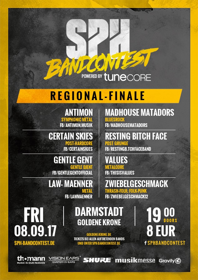 Es gibt kaum etwas schwereres, als Bands zu bewerten, die bereits zwei Runden hinter sich haben und somit schon bewiesen haben, was sie können und wie sehr sie von ihren Fans unterstützt werden. Am 08.09.17 in der Krone in Darmstadt wagte sich die Jury des SPH Contests allerdings genau das! Der Abend steckte voller Energie, was hauptsächlich auch an dem hohen Anteil an Metalbands lag. Es gab zwei Sieger in diesem Regio-Finale und eine Wildcard wurde an den dritten Platz gegeben. Die anderen Bands dürfen sich aber absolut nicht als Verlierer sehen, da jeder sein Bestes gab und jeder Makel meckern auf hohem Niveau ist.